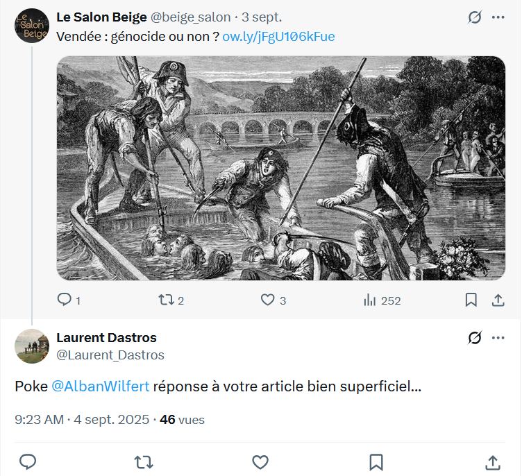 Tout cela étant dit, derrière toutes ces déformations, approximations et sélections subjectives, Le Salon Beige me rend justice sur un point. En effet, il écrit que je « conteste la notion de génocide vendéen, tout en reconnaissant la réalité des massacres ». C’est exact : je conteste une idée fausse sur le plan scientifique, ce qui ne n’empêche en aucun cas d’appuyer des événements attestés. C’est que, historien de formation et journaliste de métier, je suis attaché aux faits.