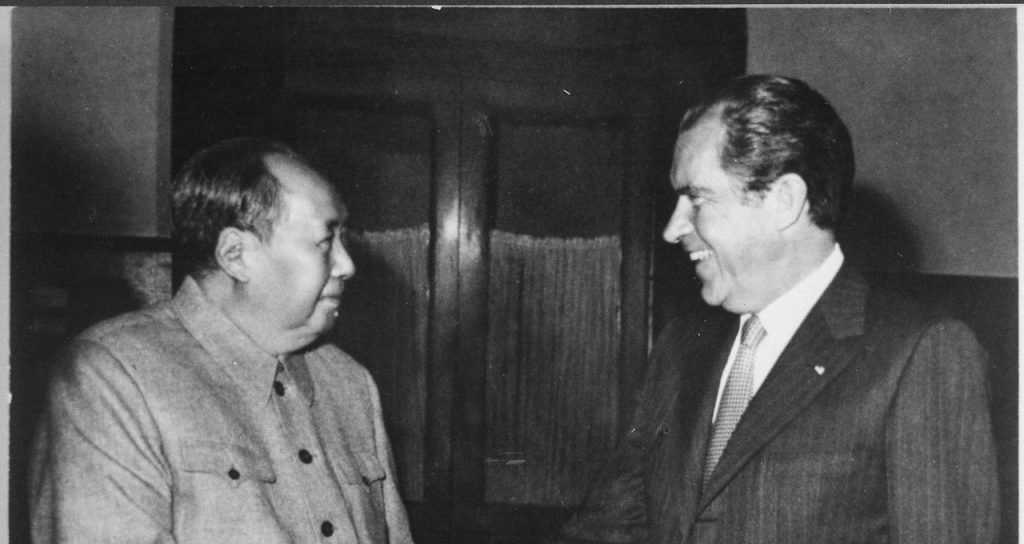 Richard Nixon, membre du Parti républicain et longtemps connu pour son anticommunisme intransigeant, surprit le monde entier en décidant, au début des années 1970, de rencontrer Mao Zedong, Grand Timonier chinois. L’heure était propice à un grand geste diplomatique : le Président américain arrivait au bout de son premier mandat et souhaitait être réélu, et la guerre du Vietnam était de plus en plus décriée. Trois ans plus tôt, un conflit frontalier avait opposé l’URSS à la Chine le long de leur frontière commune, causant plusieurs de milliers de morts dans les rangs chinois : Mao, architecte de la Révolution culturelle, manquait alors cruellement d’alliés. Pareille visite diplomatique entre des États que tout opposait devant les caméras du monde entier représentait, pour les deux dirigeants, l’occasion de relancer leur carrière politique.